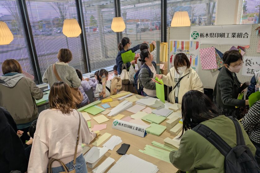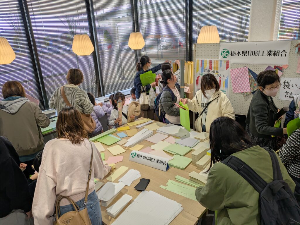 今回、当工組としてテーマを「紙の詰め放題」とし、組合員及びその他関係者の皆様から素材・大きさ・色・柄と様々な端材(用紙)を提供していただき、「袋いっぱい」に詰めていただく企画です。町民の方々をはじめ他市町から参加された大勢の皆様に喜んでいただき、大盛況のうちにイベントを終えることが出来ました。 今後もイベント等また一緒に盛り上げていければと考えております。